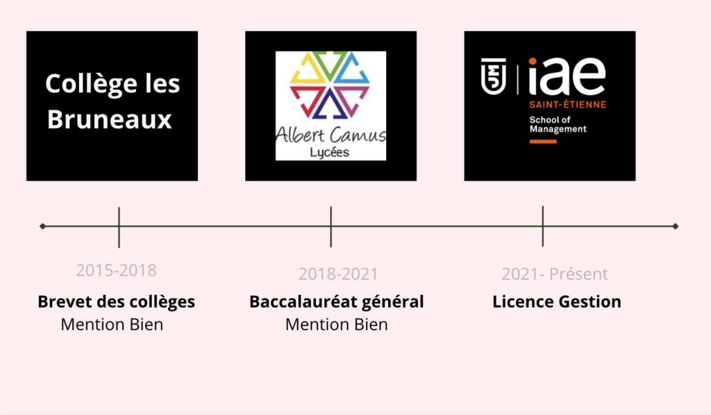 Après mes années de collège, je suis allée en seconde générale au lycée Albert Camus de Firminy. J’ai par la suite effectué une première générale toujours avec des options (à cause de la réforme), j’avais pris option Anglais LLCE (Langues Littératures et Cultures Étrangères) et SES (Sciences Économiques et Sociales) et une option Mathématiques. J’ai fait la même chose pour mon année de terminal et j’ai obtenu mon Baccalauréat avec mention Bien avec plus de 14 de moyenne.